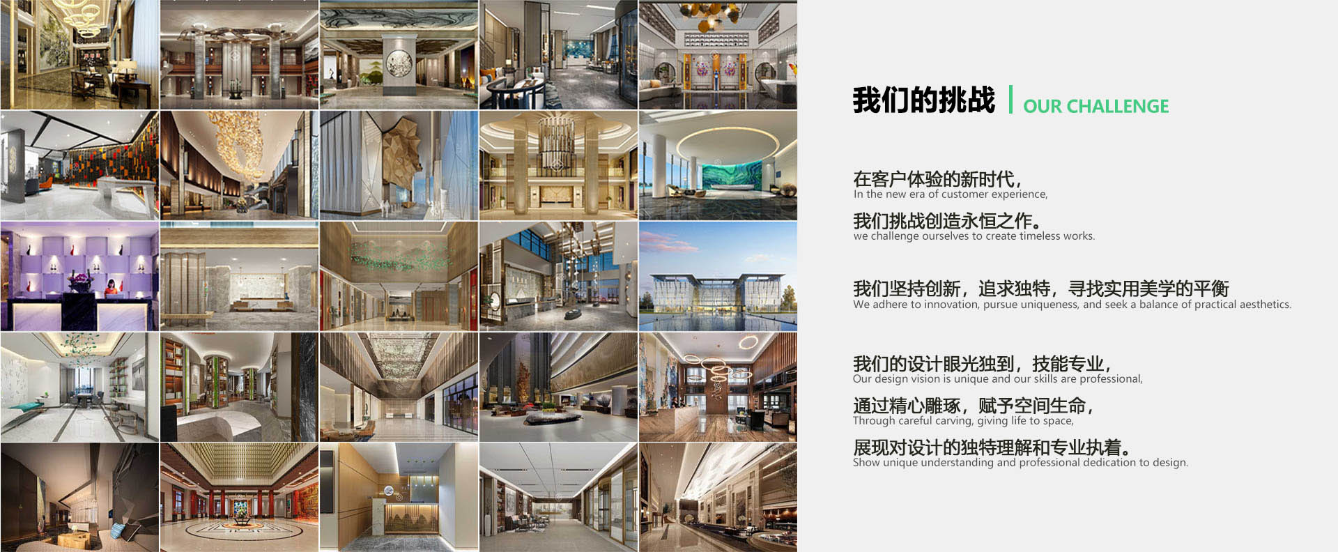 我們承襲傳統文化精神,同時瞄準商業規律,追求卓越作品。20年來,我們堅守設計精品酒店、星級酒店、主題酒店、商務酒店,以及頂級娛樂商務會所、夜總會、KTV、量販KTV、水療、酒吧和高級休閑會所等的裝飾設計,以市場視角看待設計,為客戶創造超值設計作品。